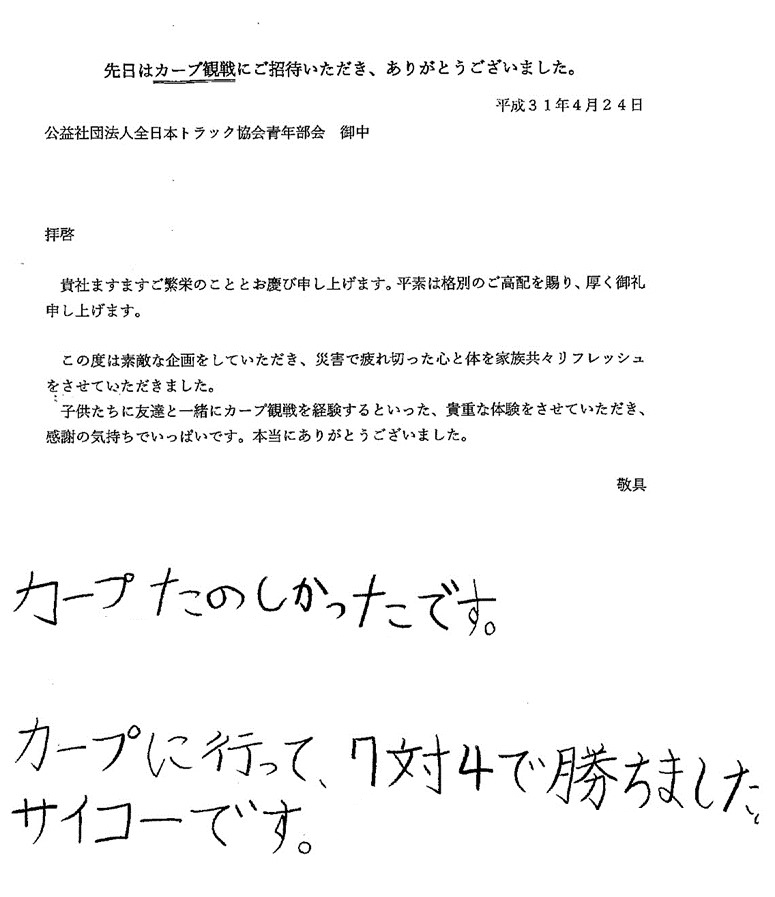 (観戦後、招待したお子さんから送られてきたお礼状他)