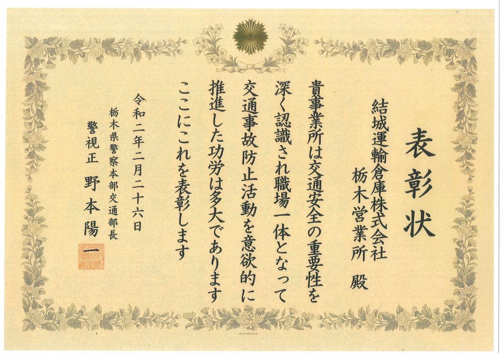 2月26日に栃木県トラック協会で開催された第3回交通事故防止優良事業所(栃木県警察本部交通部長)表彰において